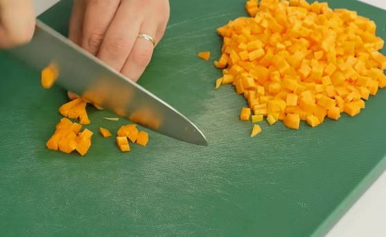 - Allereerst wassen we de zoete paprika en snijden hem vervolgens in de lengte in twee delen. Snijd na het verwijderen van de kern met zaadjes het vruchtvlees van de paprika in zo klein mogelijke blokjes.