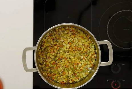 - Na het roeren van de inhoud van de pan, blijven we de groenten vijf minuten sudderen, zonder het vuur te verhogen.
