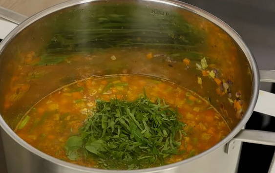 - We vullen onze soep 10 minuten voor het uitschakelen met kruiden. Giet er zout en gemalen peper in. We koken nog 5 minuten en zetten het vuur uit. Dek de soep vervolgens af met een deksel en laat 10 minuten trekken.