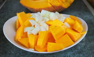 Schil de pompoen en snijd hem in middelgrote stukken. Maal de uien en knoflook meteen fijn.