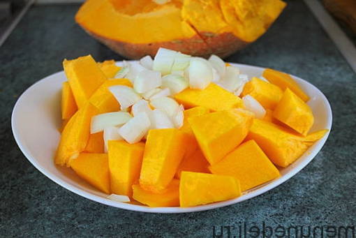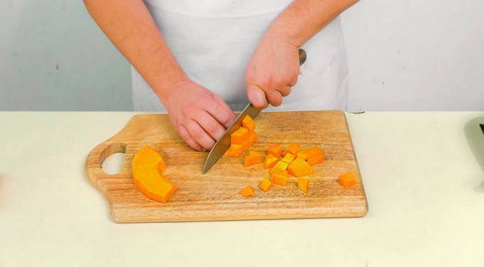 - We maken de pompoen schoon van de schil en zaden en snijden het product vervolgens in kleine blokjes. We bakken het 20 minuten met zout en peper op een temperatuur van 200 graden.