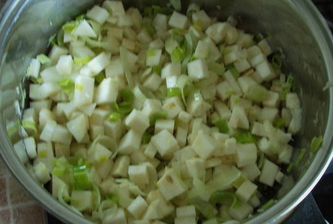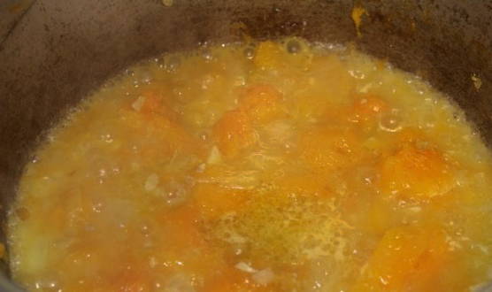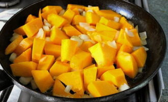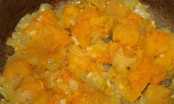 - Stoof ui, knoflook en pompoen in een koekenpan in boter. 5 minuten is voldoende.