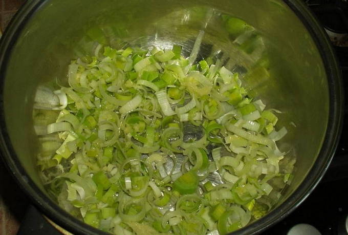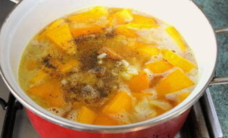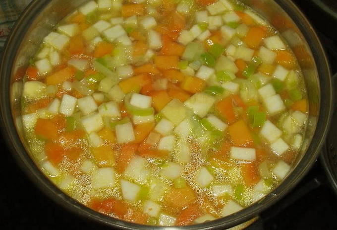 Vervolgens dompelen we de ingrediënten onder in een pan met groentebouillon. We vullen de bereiding aan met zout en kruiden. Kook gedurende 20 minuten op laag vuur.