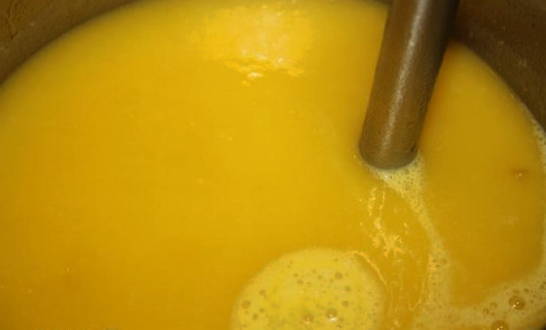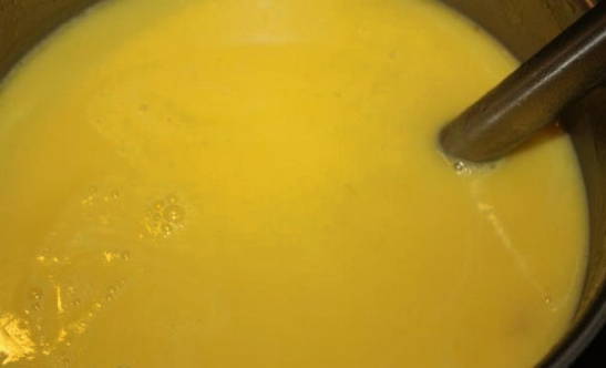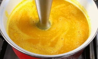 Giet room in de afgewerkte massa en maal de inhoud met een staafmixer.