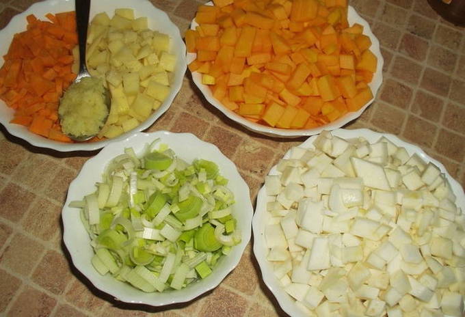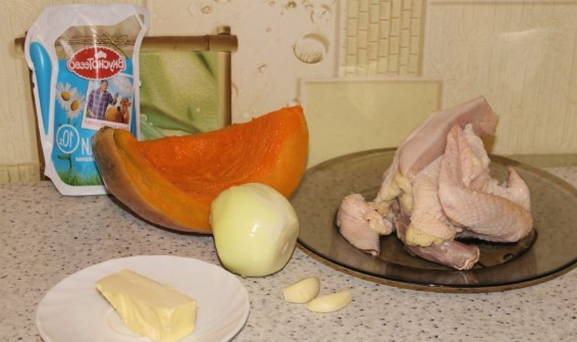 - We zullen de nodige producten bereiden om te koken. We maken de pompoen en andere groenten schoon. Verdeel de kip in middelgrote stukken.