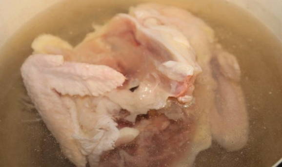 - We sturen de kip naar een pan, vullen hem met water en koken tot bouillon is verkregen. Zout naar smaak.