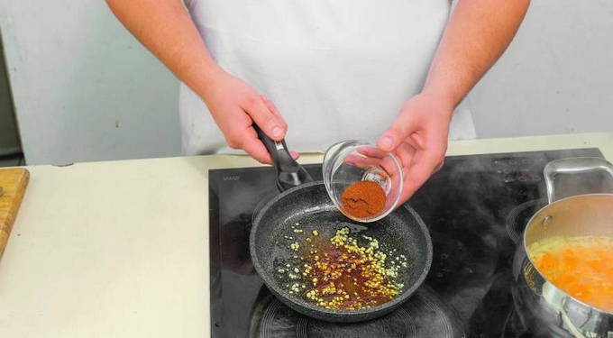 - Bak in korte tijd de resterende gember in olijfolie. Voeg hier gemalen paprika toe.