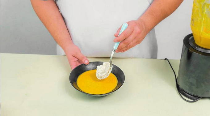 - Giet het resulterende product in borden en voeg afzonderlijk porties slagroom toe.