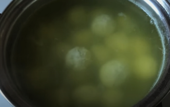 - Leg de gehaktballen in kokend water en kook ze ongeveer tien minuten. Verwijder de afgewerkte gehaktballen uit de bouillon en stuur erwten op hun plaats.