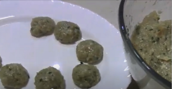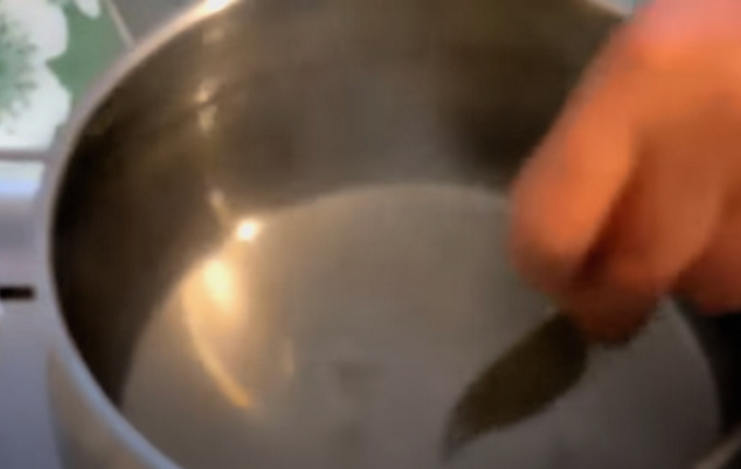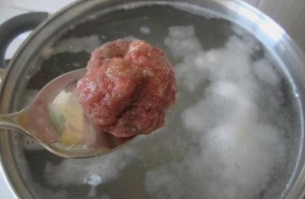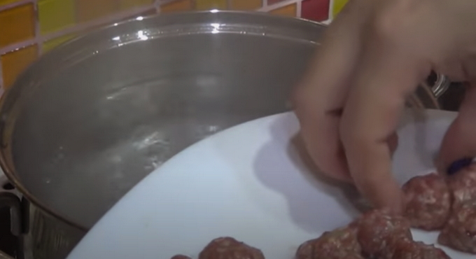 - Vul een pan met drinkwater en doe daar laurierblad en zout in. Wanneer het water begint te koken, begin je met het vormen van de gehaktballen. Om dit te doen, week je je handen in koud water en vorm je dezelfde kleine balletjes gehakt.
