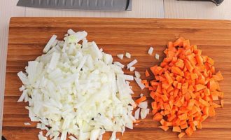 - Spoel de uien en wortelen onder stromend water, schil en hak ze fijn. U kunt de wortelen echter raspen op een middelgrote rasp. Verhit wat plantaardige olie in een koekenpan en bak hierin de wortelgroenten tot ze transparant zijn.