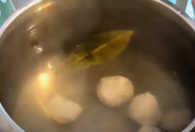 - Giet schoon water in een pan en breng het aan de kook. Vergeet niet om laurierblaadjes en zout toe te voegen.Leg de gehaktballen voorzichtig in kokend water en kook ze letterlijk vijf tot zeven minuten.