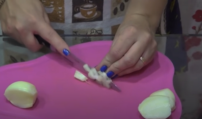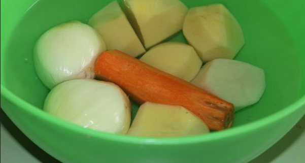 - Haal de gekookte gehaktballetjes uit de pan met een schuimspaan en hak op hun plaats willekeurig de aardappelen, precies in gewicht boven de pan. Schil de wortelen en uien, spoel ze af en hak of rasp ze vervolgens fijn op een middelgrote rasp.