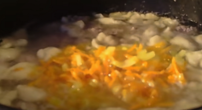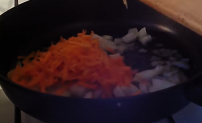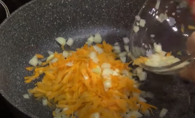 - Verhit plantaardige olie in een koekenpan en dip in de ui en wat wortelen. Fruit groenten tot ze transparant zijn, zonder te frituren.