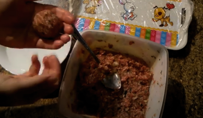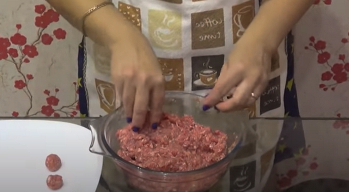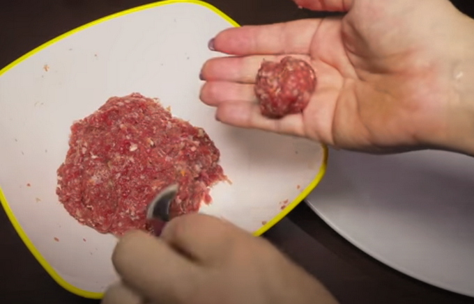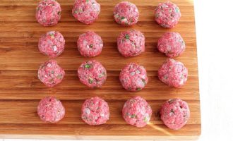 - Kneed het gehakt goed met je handen en vorm het vervolgens tot kleine ronde gehaktballetjes van gelijke grootte.