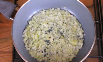 In plantaardige olie voorverwarmd in een koekenpan met antiaanbaklaag, bak de ui goudbruin.