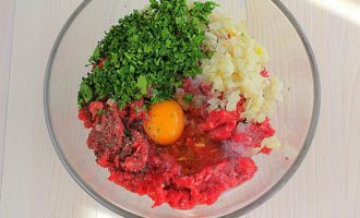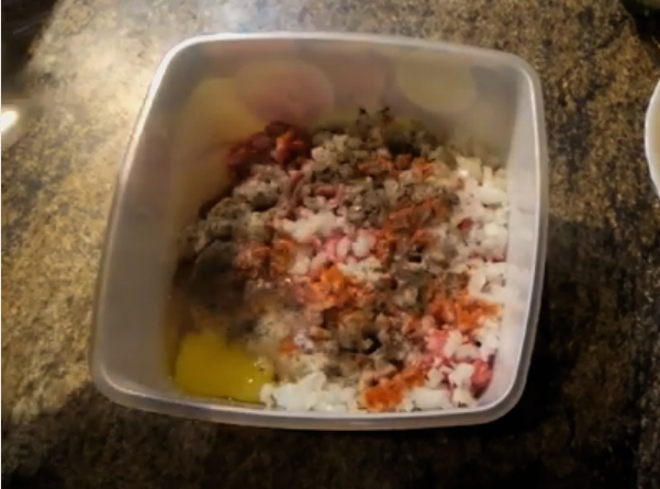 - Voeg zout en peper toe aan een kom gehakt, breek daar een kippenei en meng goed. Voeg vervolgens uien, wortelen en griesmeel toe aan het gehakt. Kneed het gehakt goed door en laat het tien minuten rusten.