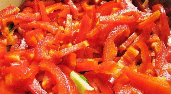 - Spoel zoete paprika's onder stromend water en schil ze. Verwijder de zaden en tussenschotten en snijd het fruit in reepjes.