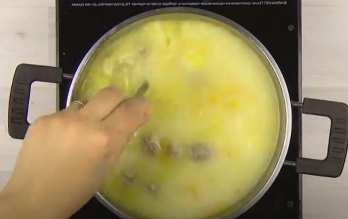 - Doe de blokjes kaas in al actief kokend water en roer het water totdat de kaas daar volledig is opgelost. Leg vervolgens de gevormde gehaktballetjes in de sudderende soep en kook ze ongeveer vijf tot zeven minuten.