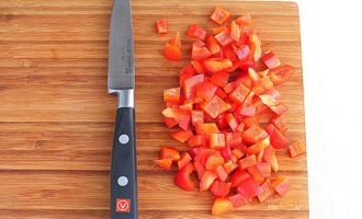 Spoel zoete paprika's onder stromend water en schil ze. Verwijder de zaden en tussenschotten en snijd het fruit in blokjes.