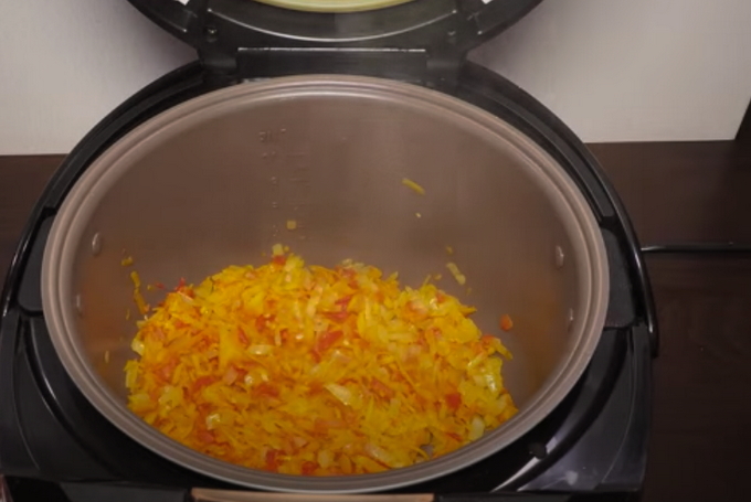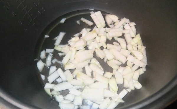 - Schil de uien en wortelen en snij ze vervolgens met een scherp mes in kleine blokjes. Je kunt in plaats daarvan ook de wortelgroenten raspen. Zet de multicooker aan in de modus "Groenten braden" gedurende tien minuten en fruit de uien in olie tot ze goudbruin zijn, zonder het deksel van het apparaat te sluiten.