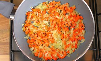 Voeg gehakte wortelen en paprika's toe aan de pan met de overgebleven uien en bak de groenten op laag vuur, en vergeet niet te roeren.