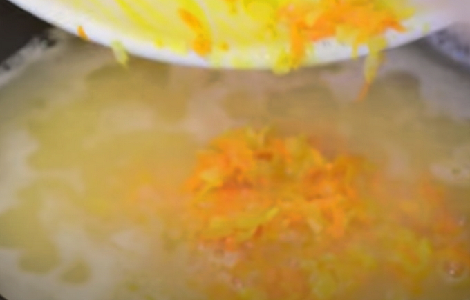 - Kook de soep onder het deksel op laag vuur. Schil aardappelen en wortelen, spoel ze af onder stromend water. Rasp de wortelen op een middelgrote rasp en snijd de aardappelen in willekeurige stukjes of blokjes. Stuur de groenten naar de pot met erwten.