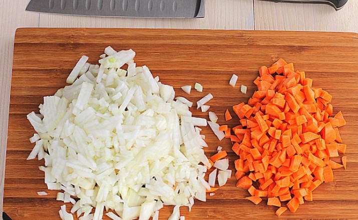 - Spoel de uien en wortelen onder stromend water, schil en hak ze fijn. U kunt de wortelen echter raspen op een middelgrote rasp. Verhit wat plantaardige olie in een koekenpan en bak hierin de wortelgroenten tot ze transparant zijn.