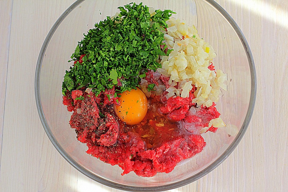 - Voeg zout en peper toe aan een kom gehakt, breek daar een kippenei en meng goed. Voeg vervolgens uien, wortelen en griesmeel toe aan het gehakt. Kneed het gehakt goed door en laat het tien minuten rusten.