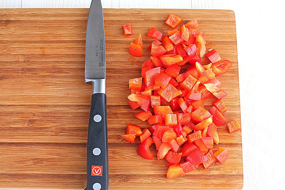 Spoel zoete paprika's onder stromend water en schil ze. Verwijder de zaden en tussenschotten en snijd het fruit in blokjes.