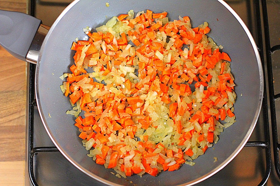 - Verhit plantaardige olie in een koekenpan en dip in de ui en wat wortelen. Fruit groenten tot ze transparant zijn, zonder te frituren.