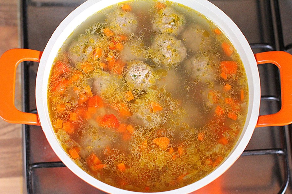 - Leg de gehaktballetjes voorzichtig in kokend water en kook ze ongeveer tien minuten. Leg daar vervolgens de in blokjes gesneden, voorgeschilde aardappelen. Doe na nog eens tien tot vijftien minuten de gefrituurde groenten in een pan met soep en kook het gerecht verder tot het volledig gaar is, en vergeet niet om het te zouten.