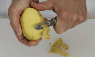 - Was de aardappelen onder de kraan of in een pan, verwijder de schil en snij in vierkanten, doe ze dan in de pan. Giet er water in en laat koken. Voeg tijdens het koken wat zout toe. We vertrekken voor 20 minuten.