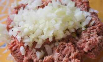 Terwijl de aardappelen koken, doen we het gehakt. Maal het samen met de ui. Dus hakken we de ui fijn en passeren deze samen met het vlees door een vleesmolen. Uien zijn een geweldig ingrediënt voor het toevoegen van sappigheid. Voeg voor de smaak van het vlees peper en zout toe. Van het gehakt vormen we ronde gehaktballen en leggen deze op de aardappelen. Om ze dicht en gelijkmatig te maken, neem ze met natte handen of voeg een beetje griesmeel toe aan het gehakt. Een alternatieve optie zou zijn om het gehakt op een koude plaats te "rusten".