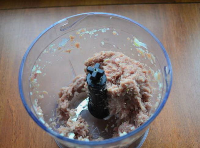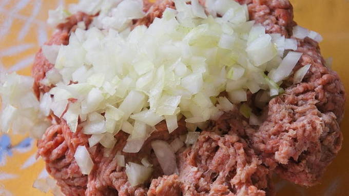 - We nemen varkensgehakt en mengen het met uien of halen het er weer mee door een vleesmolen. Doe het gehakt in een bak, voeg zout en peper toe. Het is niet nodig om het gehakt zwaar te zouten, want even later wordt het zout alsnog aan het water toegevoegd. Goed mengen.