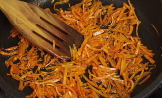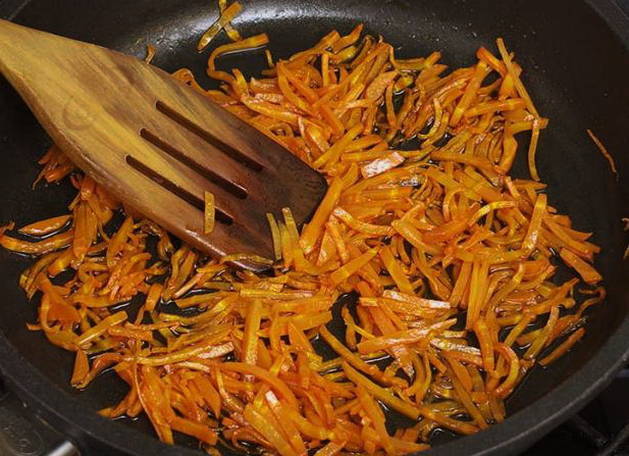 Rasp de wortelen en bak ze goudbruin in een pan. We doen het in een pan. Kook ongeveer 10 minuten.