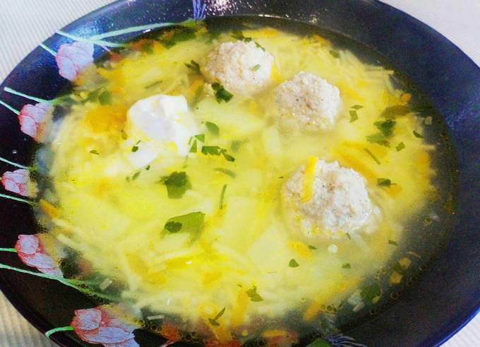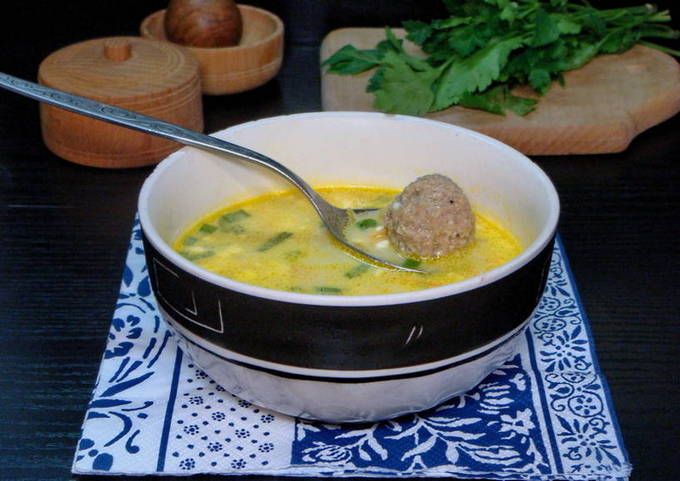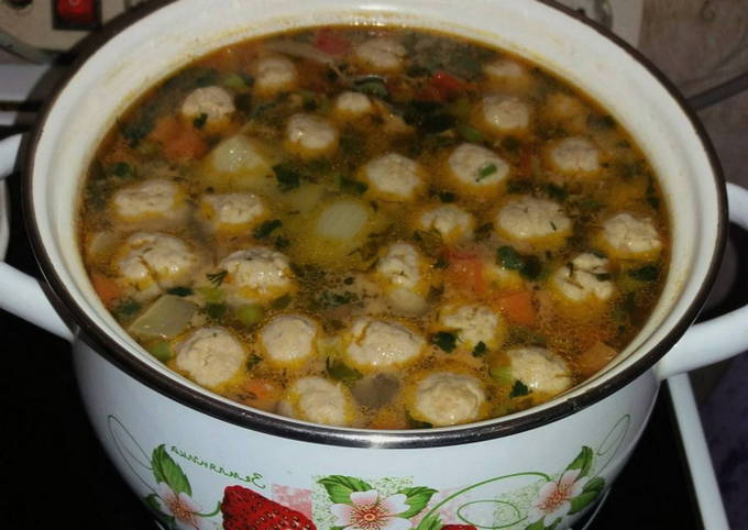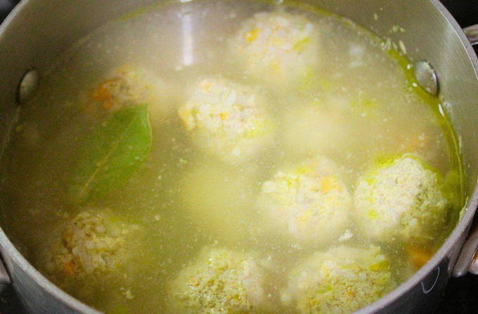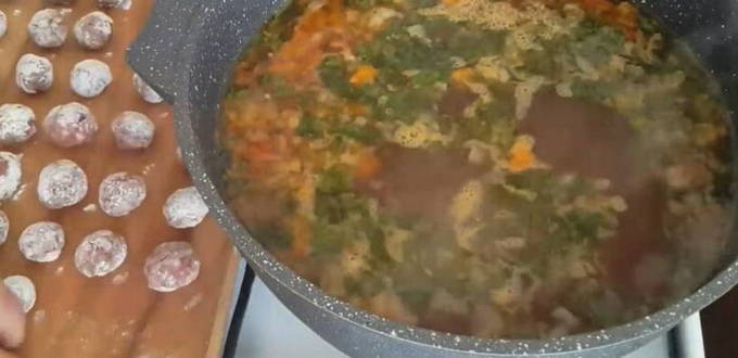 - Doe de voorbereide gehaktballetjes in de kokende soep, voeg wat zout toe en laat nog 30 minuten op laag vuur koken.