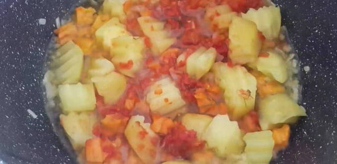 - We nemen een ketel of een pan en gieten olie. We verwarmen de ketel en bakken de uien, maar niet helemaal: lichtbruin. Voeg geleidelijk de wortels toe: het is beter om ze in blokjes te snijden dan ze te raspen. Doe daar na een paar minuten de tomatenpuree in. Was en schil de aardappelen, snijd ze in stukjes en voeg ze toe aan de voorgaande ingrediënten. Goed mengen en verder bakken.