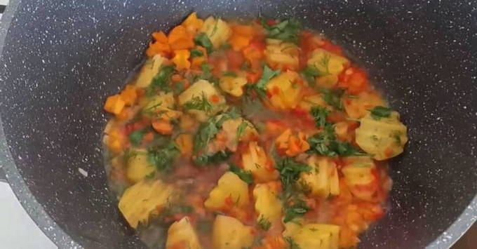 - Als de aardappelen praktisch gaar zijn, voeg je de vermicelli toe en kook je nog 2 minuten. We doen de gesauteerde groenten in een pan en koken letterlijk nog een minuut.