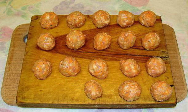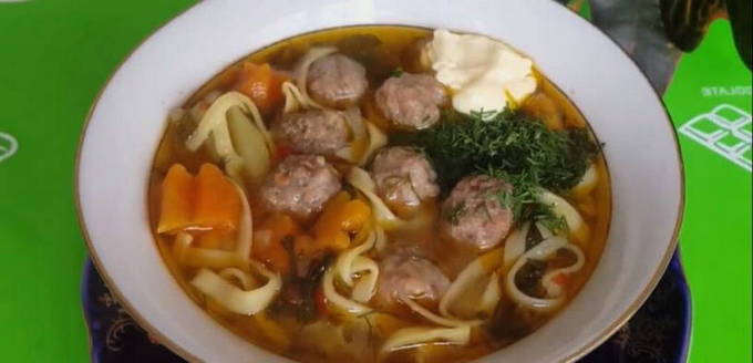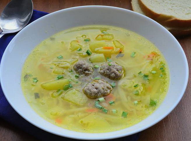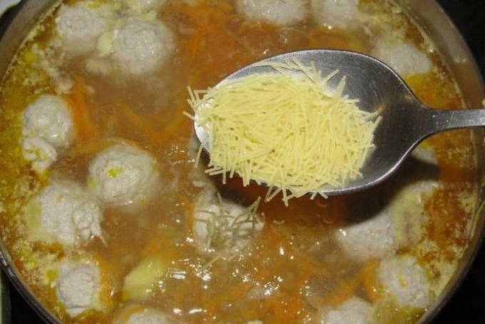 - Van gehakt met natte handen, middelgrote gehaktballen vormen, ze in kokend water doen, aardappelen toevoegen, eerder in blokjes gesneden, daar. Kook gedurende 30 minuten. Als de aardappelen zacht zijn, voeg je de noedels toe en kook je nog ongeveer 7 minuten.