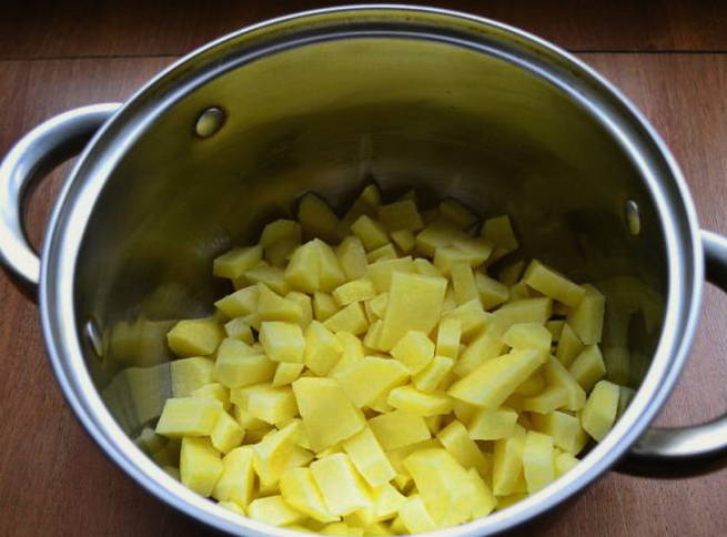 Snijd de aardappelen in blokjes. Giet water in een pan, zet het op het vuur, leg de gehakte aardappelen erin en voeg wat zout toe.