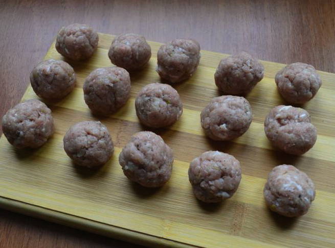 - Laten we eerst de gehaktballen bereiden. Voeg peper en zout toe aan het gehakt, zodat het niet flauw wordt. Meng daarna goed en rol de gehaktballetjes, terwijl het beter is om je handen nat te maken zodat het gehakt niet plakt en de balletjes gelijk zijn.