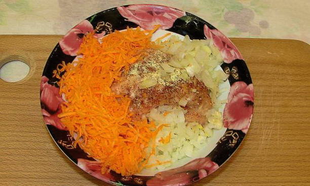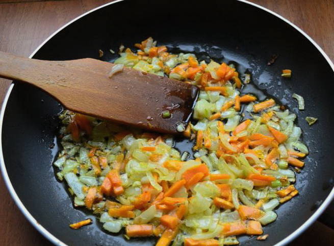 - Snijd de wortelen in lengtestroken, hak de ui fijn. Vet de pan in met olie (het is beter om plantaardige olie te nemen) en bak de wortelen en uien in de pan. De mate van gereedheid wordt het meest betrouwbaar herkend door de resulterende gouden korst.