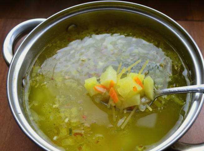 - Op dit moment wassen en schillen we groenten. Snijd de wortelen of drie, zoals je wilt, snipper de ui en snijd de aardappelen in blokjes. In een koekenpan, met plantaardige olie, sauteer wortelen en uien: dit wordt bakken voor onze soep. Voeg aardappelen en laurierblaadjes toe aan de soep en kook nog eens 15 minuten.