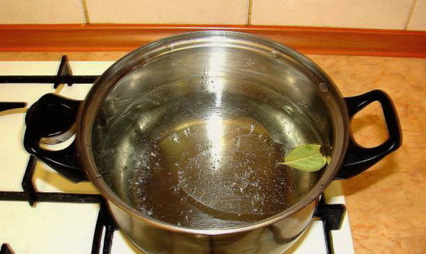 - Neem een middelgrote pan en vul deze voor de helft met water, voeg plantaardige olie en laurierblaadjes toe. In brand steken.