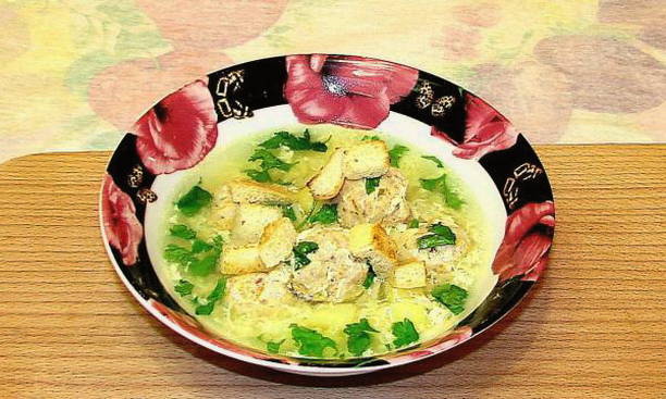 - Voeg de gehaktballen en knoflook toe, die voorgesneden moeten zijn. Kook de soep nog een beetje - en hij is klaar. In plaats daarvan serveren we de soep om te testen.