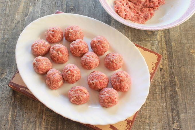 - Gehaktballen maken. Meng het gehakt met ui en zout. Uien zijn een eerste vereiste voor rundergehaktballen omdat ze er sappigheid en smaak aan toevoegen.Goed mengen en kloppen: neem het gehakt en gooi het op een stevige ondergrond of op de bodem van de kom. We vormen gehaktballetjes, klein van formaat, zodat ze gemakkelijk te eten zijn, en rollen in bloem.