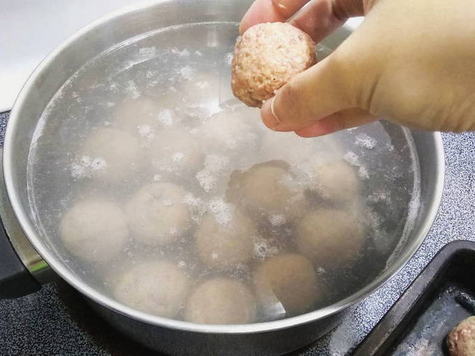 - We nemen een middelgrote pan en vullen deze voor de helft met water en sturen deze naar het vuur. Voeg wat zout toe aan het water en wacht tot het kookt. Leg daarna de gehaktballen daar en kook gedurende 15 minuten. Verwijder het resulterende schuim met een lepel zodat de bouillon transparant blijft.