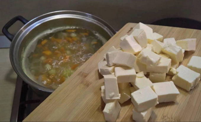 - Als de aardappelen gaar zijn, voeg je vermicelli toe en bak je deze mee. We snijden de smeltkaas en voegen deze ook toe aan de soep, die nog 7 minuten moet worden gekookt, zodat de noedels meerdere keren groter worden en opzwellen. De bouillon moet mogelijk licht gezouten worden. Voeg greens toe en haal de pan met soep van het fornuis.