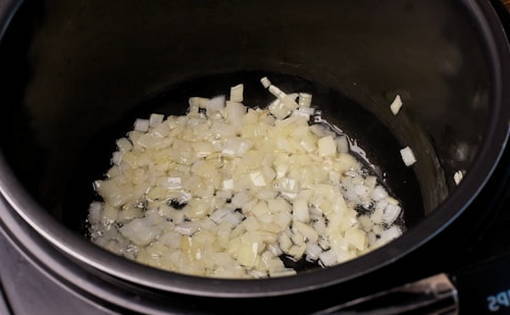 - We nemen een kom van een multicooker, meten plantaardige olie af met een lepel of een maatbeker, gieten deze in deze kom en starten de "Frituren" -modus. Als deze functie niet aanwezig is, kunt u "Bakken" gebruiken. Op dit moment schillen en hakken we de ui fijn, voegen deze toe aan de kom en, roerend, koken tot ze transparant zijn.